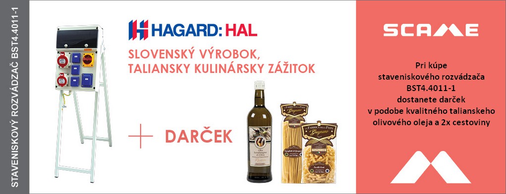 SCAME predajná akcia, slovenský výrobok, taliansky kulinársky zážitok. Za nákup staveniskového rozvádzača získate olivový olej a 2x cestoviny.
